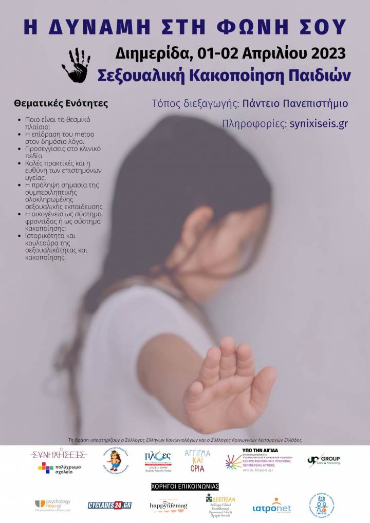 Η διημερίδα αποτελεί πρωτοβουλία του κέντρου "ΣΥΝΗΧΗΣΕΙΣ", όπου μαζί με τους παραπάνω φορείς και την υποστήριξη του Κέντρου Κοινωνικής Πρόνοιας Αττικής, θα πραγματοποιηθεί στις 1 και 2 Απριλίου στο Πάντειο Πανεπιστήμιο, με στόχο την ενημέρωση και την ευαισθητοποίηση για το φαινόμενο της σεξουαλικής κακοποίησης παιδιών. Τέτοιου τύπου δράσεις είναι εξαιρετικά σημαντικές ειδικά σε μια περίοδο που τέτοια ζητήματα ανοίγονται, με συνεχείς δυσάρεστες αφορμές, προς συζήτηση στο κοινωνικό διάλογο. Τη δράση υποστηρίζουν ο Σύλλογος Ελλήνων Κοινωνιολόγων και ο Σύνδεσμος Κοινωνικών Λειτουργών Ελλάδος. Τέλος, ο Σύλλογος Ειδικού Εκπαιδευτικού Προσωπικού Ειδικής Αγωγής Αττικής (ΣΕΕΠΕΑ Αττικής) και το Ινστιτούτο Μελετών και Ερευνών Γενικής και Ειδικής Εκπαίδευσης (ΙΜΕΓΕΕ) συμμετέχουν ως χορηγοί επικοινωνίας.